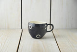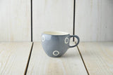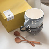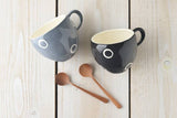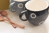 A gift set with 2 porcelain mugs and 2 wooden spoons. These large mugs with hollow polka dots are your best companion from mocha to even soup. The mugs are dishwasher safe, and hand wash is recommended for the spoons. Mino ware. Made in Japan.