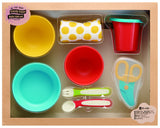 An assortment of colourful dining necessities for the little eater in the family. Set includes: 2 bowls, 1 plate, 1 cup with lid, 1 fork, 1 spoon, 1 face towel, 1 tray, and 1 pair of baby food scissors. Microwave and dishwasher safe. BPA free. Made in Japan.