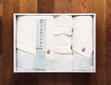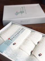 100% cotton certified Imabari towels with elegant patterns of elaborate medallions symbolizing the waters of Imabari. Set includes one bath towel, one hand towel, and three face towels. Made in Japan.