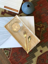 A set of 5 golden teaspoons and 5 dessert forks in a simple design. Polished to an elegant mirror finish for ultimate subtle luxury. 18-8 stainless. Made in Japan. (Wood tray and glass set sold separately.)