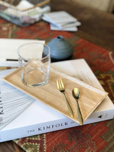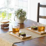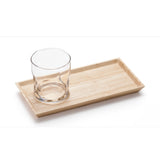 Enjoy the smooth texture of handmade blown glass and snacks on the side on a wooden tray. Set includes one rubber wood tray and one glass. Glass is made in Japan. (Cutleries sold separately.)